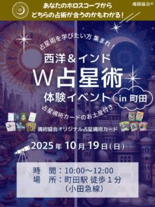 占い師さんのための占術を学ぶ体験会in町田。W占星術×ヴェーダ数秘魂術×ヴェーダ数秘ルノルマンカード体験会を開催します。 魂術協会®がこれまでに行ったイベントの地域 魂術協会、次回の体験会は 2025年10月19日(日)