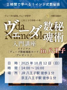 占い師さんのための占術を学ぶ体験会in八王子。W占星術×ヴェーダ数秘魂術×ヴェーダ数秘ルノルマンカード体験会を開催します。 魂術協会®がこれまでに行ったイベントの地域 魂術協会、次回の体験会は 2025年10月12日(日